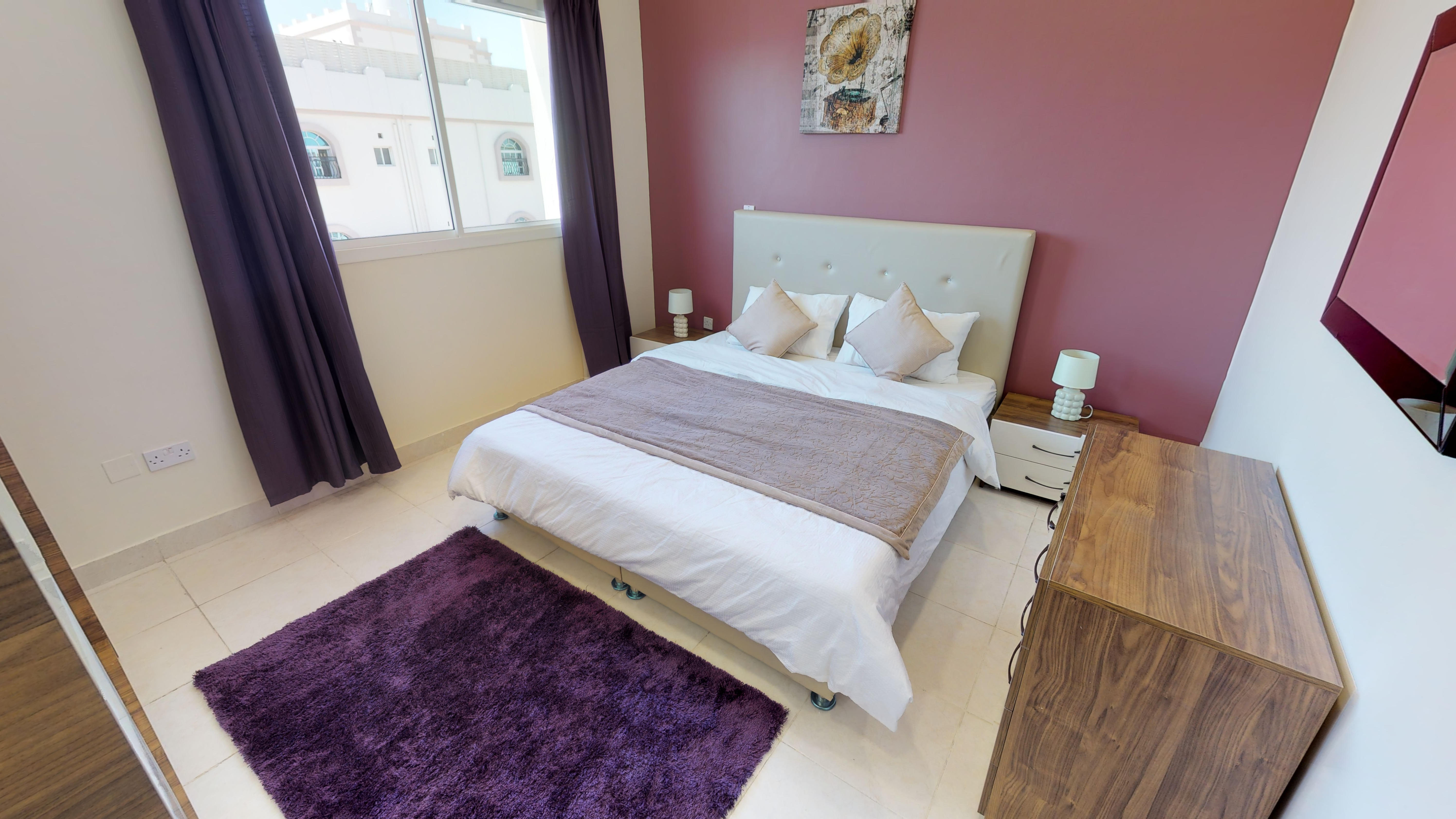 Bedroom 1:Spacious luxury bedroom with Queen bed & 2 night stands, dresser, wardrobe & split ac unit